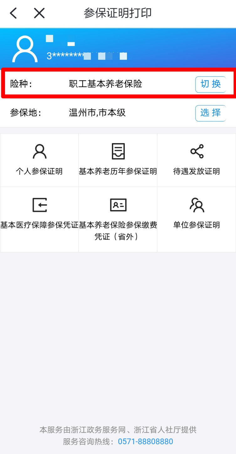 3、即进入以下界面,如红框所示的险种,默认是“职工基本养老保险”,大多数人无需去做变动,还有一些人是机关事业单位的职工,需要点击这里的“切换”,将险种切换为“机关事业基本养老保险”,才能正常打印社保证明。
