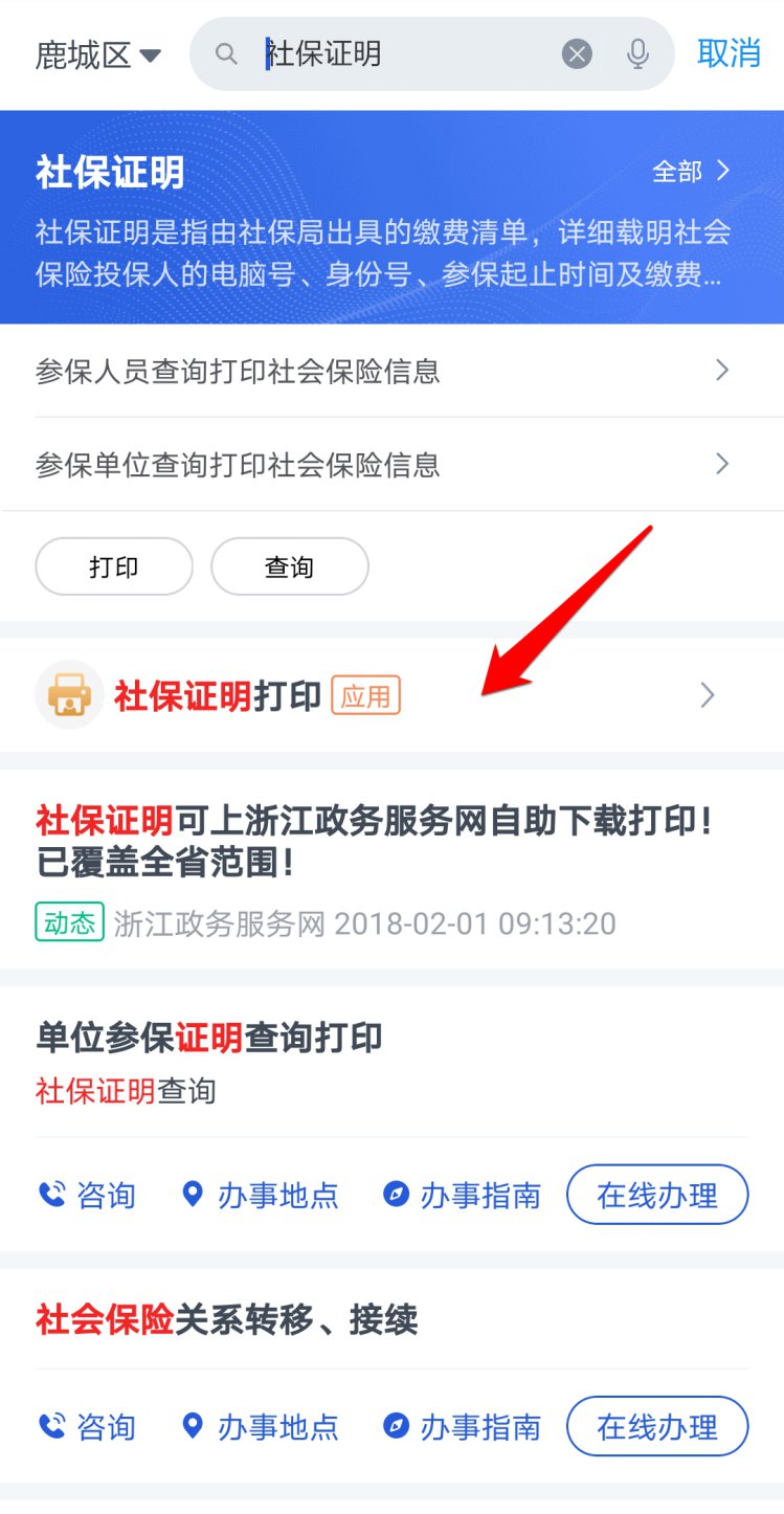 2、社保证明的用途十分广泛,虽然目前大多数政府机构已经可以通过大数据的渠道获取社保信息,无需办事群众自行提供社保证明,但是仍有不少地方要求提供社保证明。打印社保证明时,打开“浙里办”APP,搜索“社保证明”,点击下图红色箭头处所示点击进入“社保证明打印应用”。