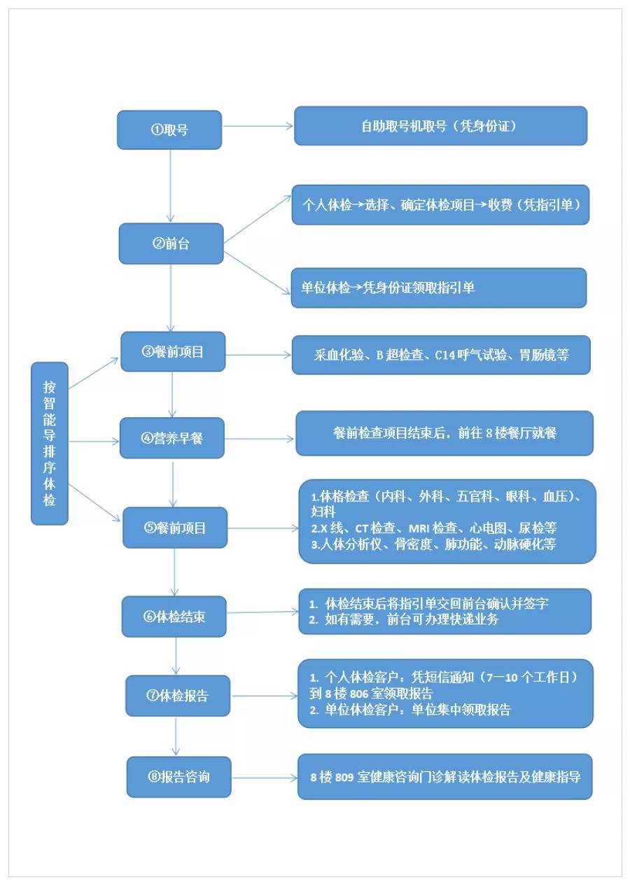 9、体检完毕后,请将指引单交回7楼前台,以确认所有项目均已完成,以防漏检,并将及时对您的体检结果进行总检。