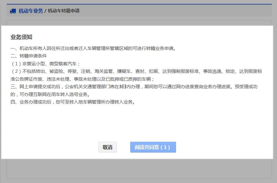 步骤3:【阅读业务须知】 用户阅读业务须知,确认后点击【阅读并同意】,进入步骤4【确认提交】。