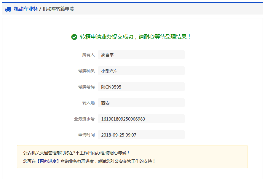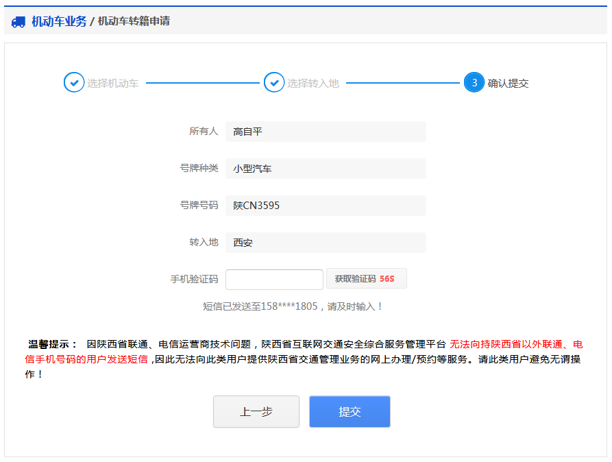 步骤4:【确认提交】 该步骤显示用户的车辆信息、转入地信息。