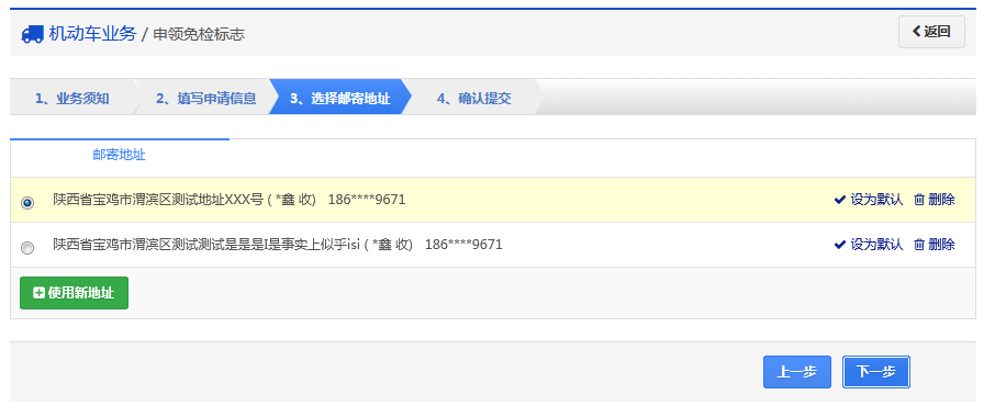 步骤3:【选择邮寄地址】返回用户选择邮寄地址,确认后点击【下一步】,进入步骤4【确认提交】。
