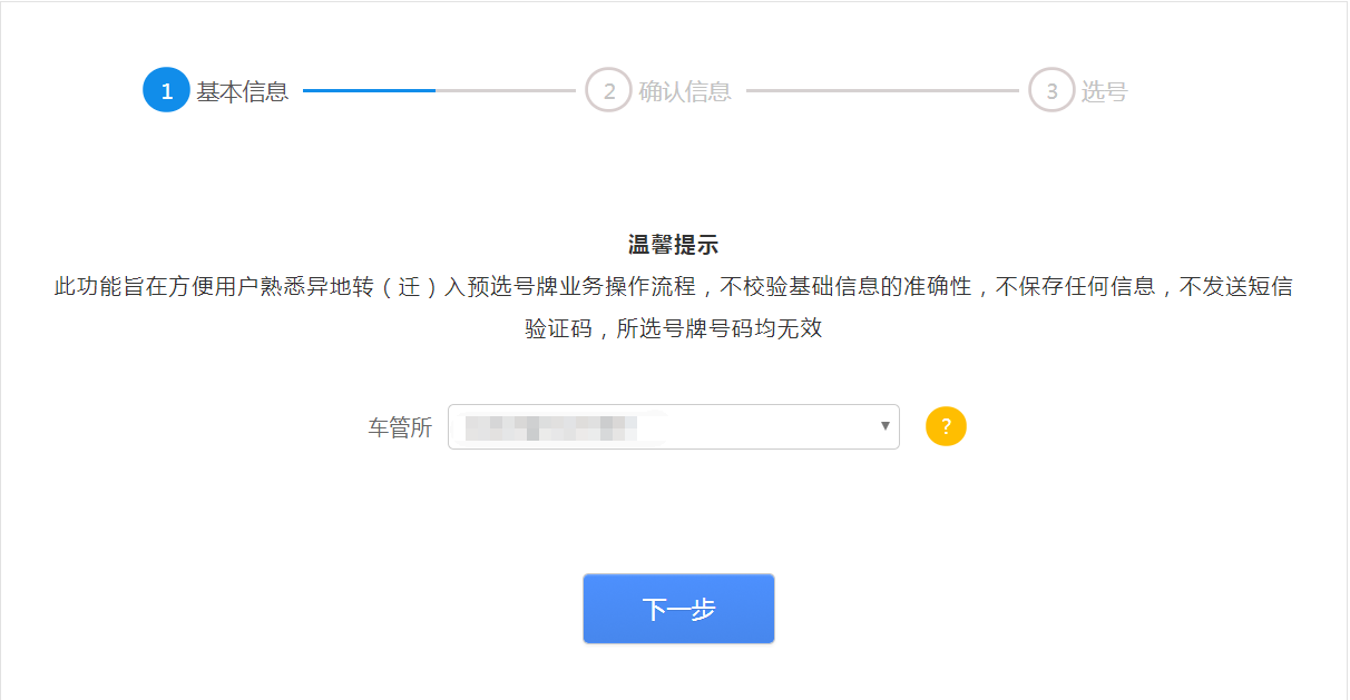 第一阶段(【步骤1:基本信息】→ 【步骤2:确认信息】→ 【步骤3:选号服务说明】)→ 第二阶段( 【步骤1:身份验证】→ 【步骤2:预选号牌】→ 【步骤3:完成号牌预选】)