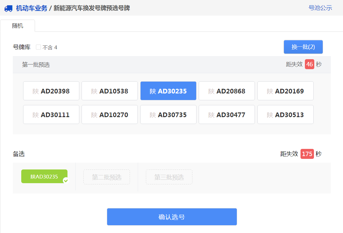 用户可以点击右上角“换一批”按钮重新进行随机(“换一批”后面的括号中的数字为用户当前选号车辆的剩余随机选号次数),此时会更新随机号牌栏中的号牌。 如果备选号牌栏中的有号牌并且没有失效,则备选栏中的倒计时将重新开始倒计时。 用户可以在新随机的号牌号码中选择一个号牌号码作为备选号牌,此时备选栏中的倒计时也将重新开始倒计时。如下图所示
