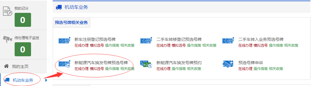 互联网注册用户在互联网登录后,点击【机动车业务】→【新能源汽车换发号牌】下的【预选号牌】进入预选号牌流程。如下图所示。