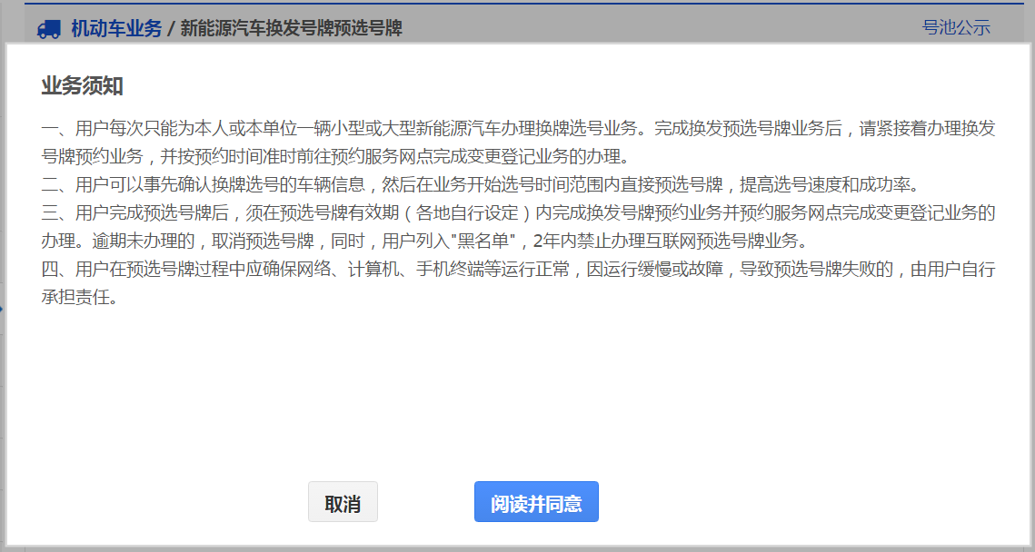 用户通过该功能可以为自己或单位名下的新能源汽车换牌预选号牌(详情请阅读新能源汽车换牌选号业务须知 )。