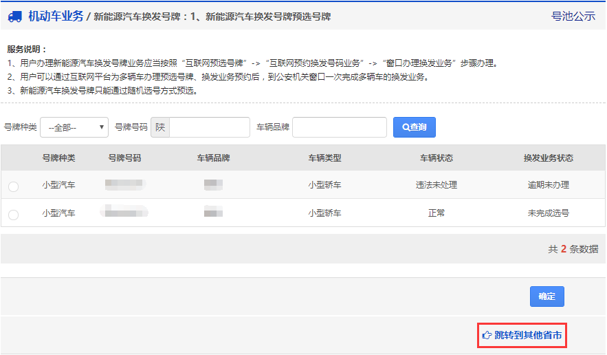 异地预选号牌: 针对新车车主、单位用户,只能在用户注册地办理预选机动车号牌业务。 对于车主/驾驶人用户、窗口注册用户,登录互联网服务平台后,可以通过正式选号中的“跳转到其他省市”链接进入异地预选号牌跳转页面。 如下图所示: