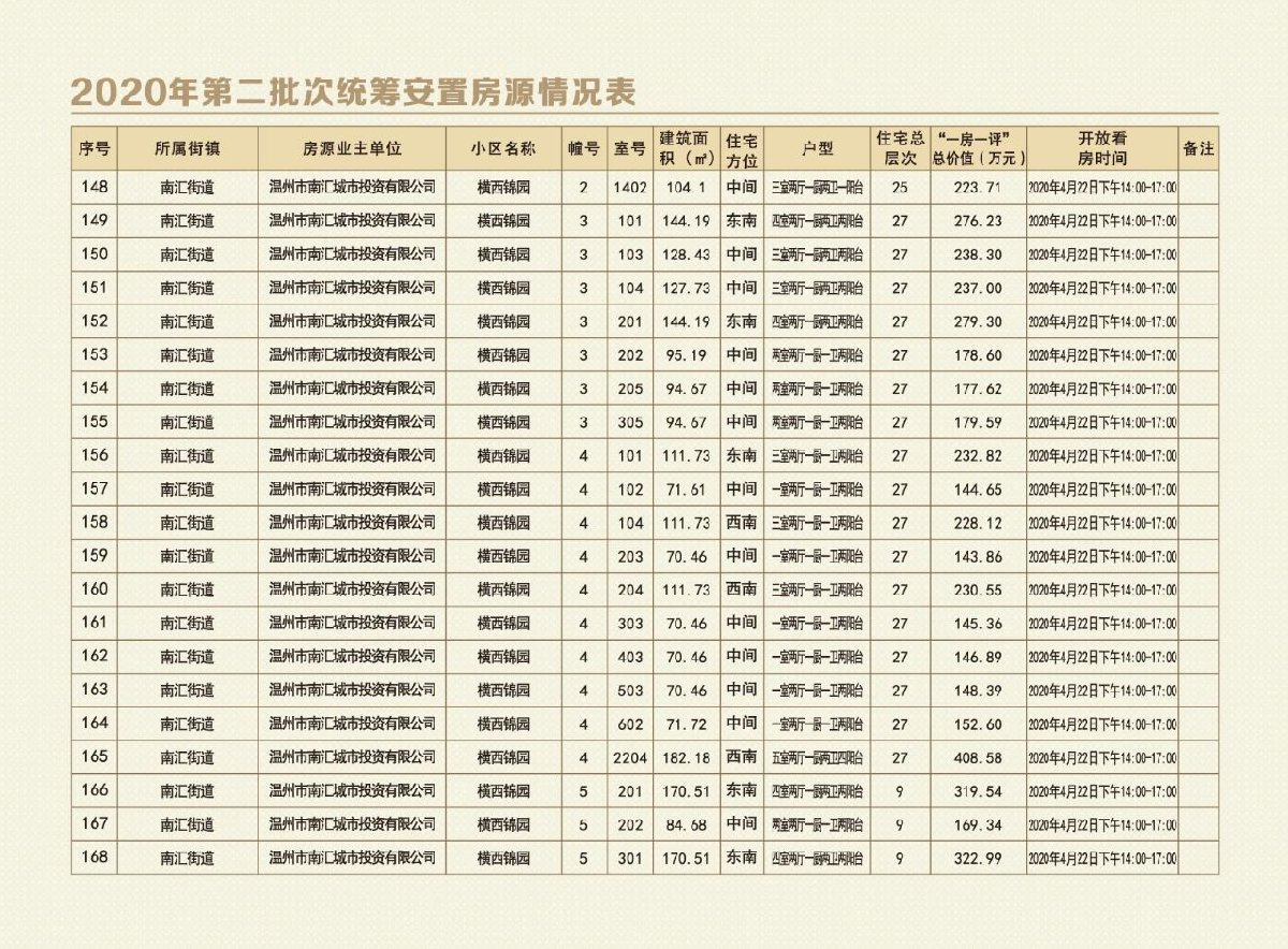 鹿城第二批次统筹安置房源合计177套,面积22978.28平方米。单套面积区间为57.06平方米—302.48平方米,价格区间为106.13万元-544.71万元,包含东立景园二组团、四至六组团、牛桥底佳苑、滨洲景园、泰屿嘉园、通泰景苑及横西锦园。