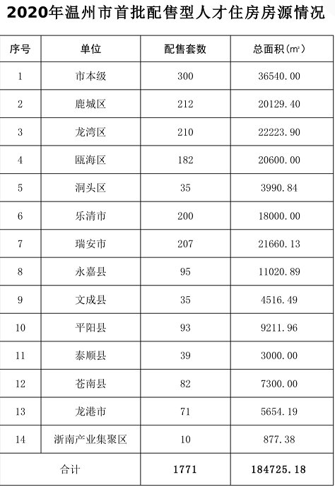 市本级的300套,面积3.65万平方米,74套为存量安置房,地理位置均位于温州市中心区域,226套为商品房配建项目的预售房,分布在市区各核心板块。具体房源信息届时将会在摇号选房公告时一并公布,人才购房对象可通过相关网站查询具体房源信息。