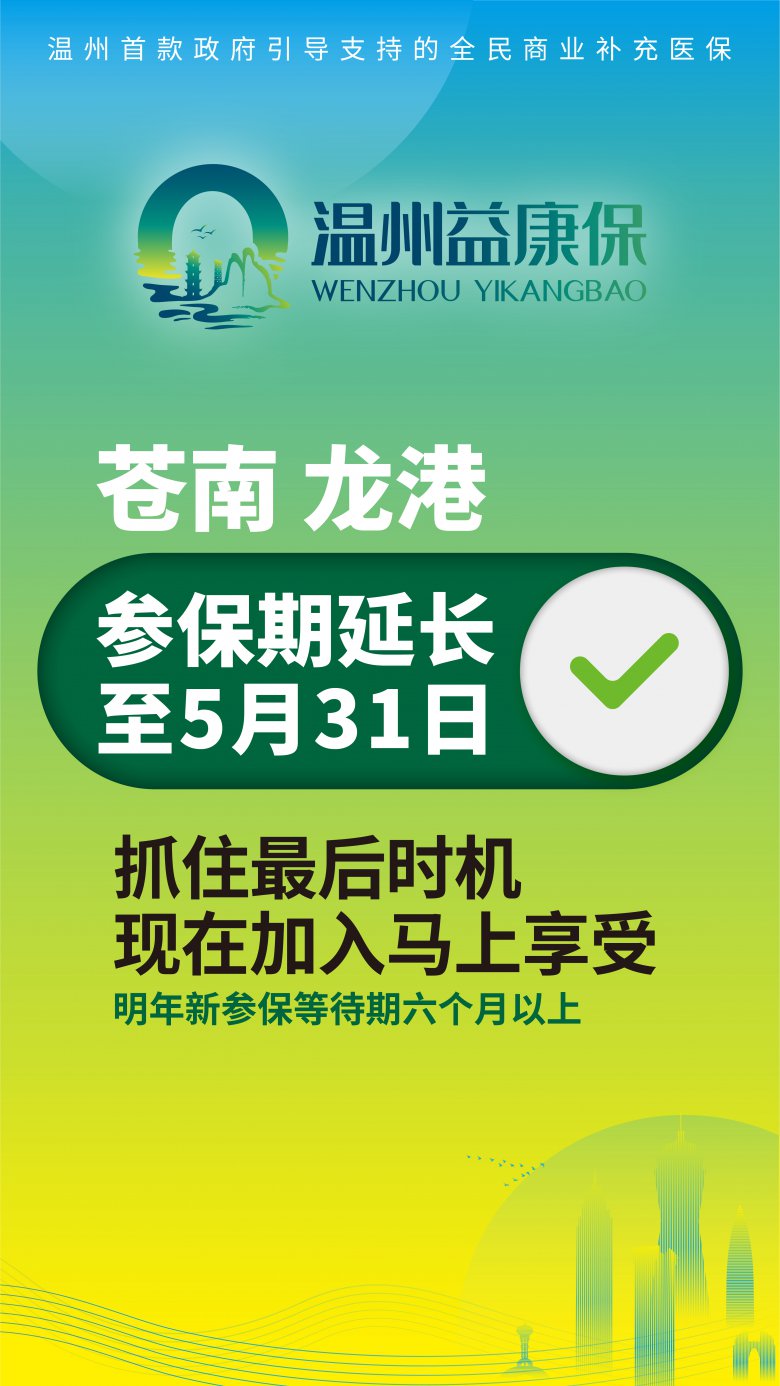 由于医保信息系统市级应用集中影响,苍南、龙港两地“温州益康保”4月1日起才正式接受投保,开始时间比温州市内其它县(市、区)晚1个月,经市全民商业补充医疗保险工作专班办公室同意,苍南县和龙港市“温州益康保”缴费截止时间延期至5月31日,现将有关事项通知如下: