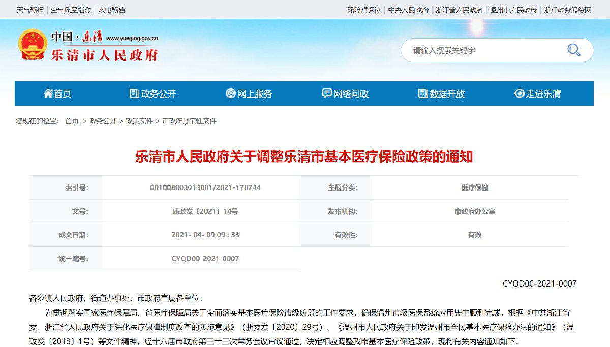 2021温州乐清市基本医疗保险政策调整 乐清市2022医保缴费