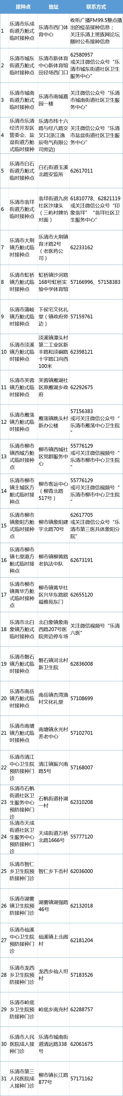 送至乐清市新冠病毒疫苗接种点名单(各接种点具体接种时间以各点公布时间为准)