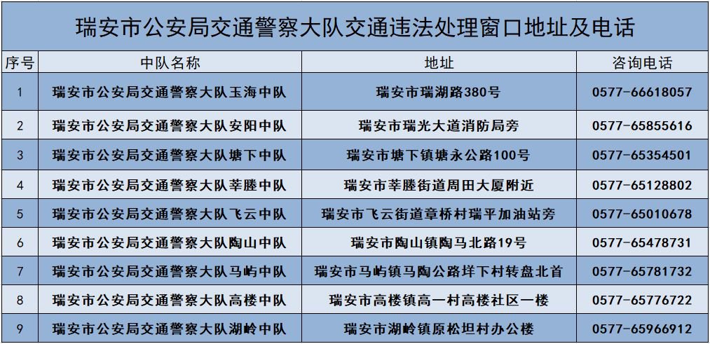 市民如需处理交通违法行为,请登录交管“12123”AP、“温州交警”支付宝生活号等手机平台网上处理,或到邮政网点“警医邮”窗口处理(详情可见“瑞安交警”微信公众号违法处理预约)。对上述途径无法处理的交通违法业务,市民可通过“瑞安交警”或以下各交警中队窗口电话预约处理。