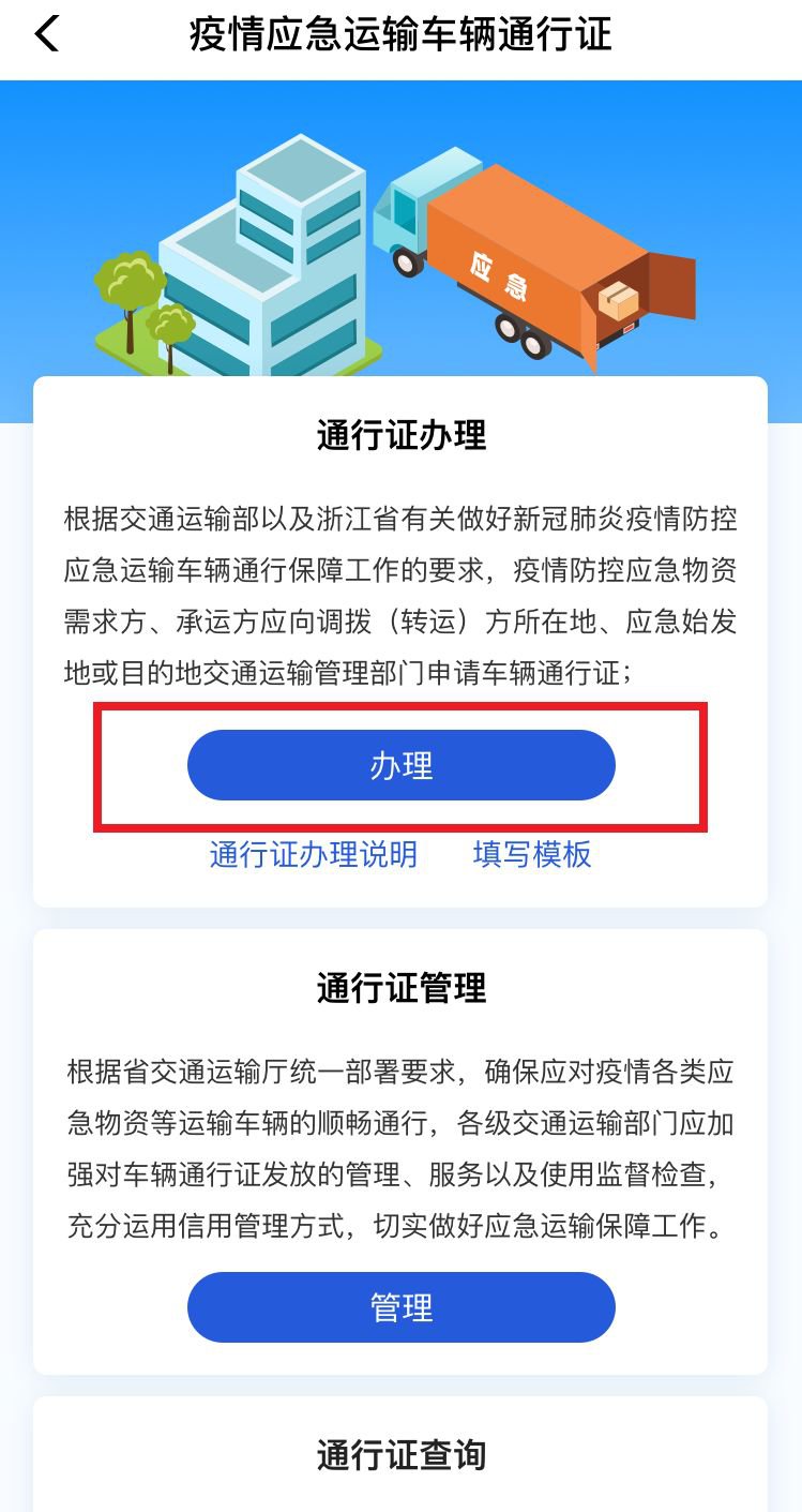 通行证办理实行承诺办理的模式,企业和单位在“浙里办APP”的综合交通服务专区如实、准确填报应急物资运输联系单(调拨单)、承运人、物资或人员、通行情况等相关信息,并在同意告知承诺书的有关内容和要求后,获取通行证电子版,申请单位可自行打印,并随车携带。
