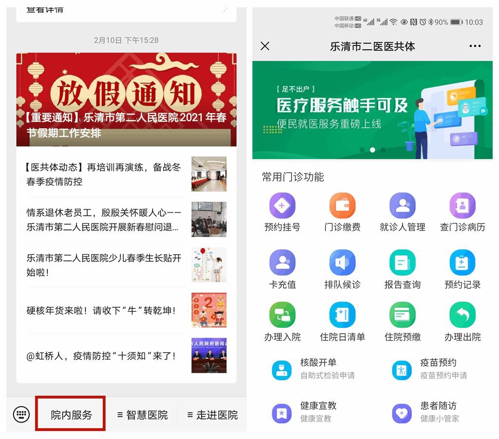 全新升级后的“乐清市第二人民医院医共体”医院微信公众号,为患者提供全流程线上服务,包括当日挂号、预约挂号、门诊缴费等功能,自助检验申请、体检报告查询、线上缴费缩短排队时间等便民服务措施。