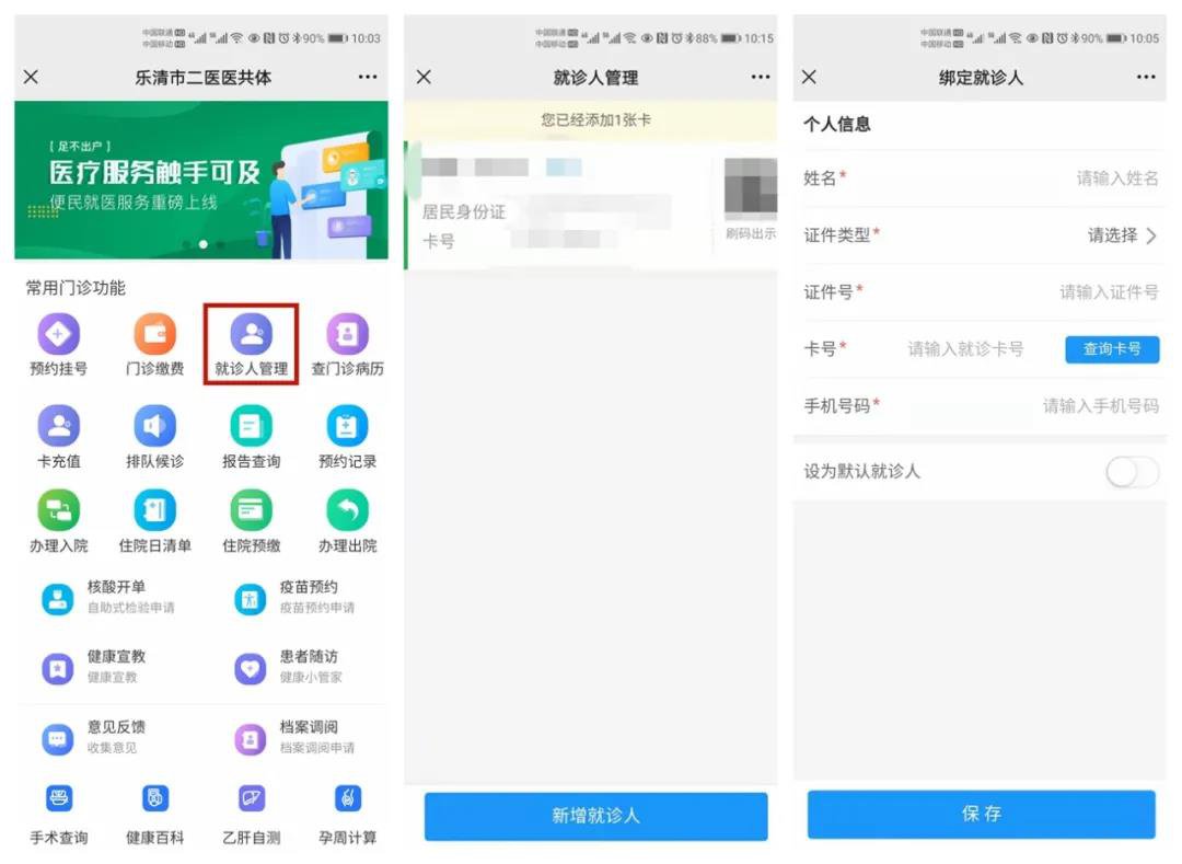 第二步、选择“就诊人管理”,点击“新增就诊人”,输入个人相关信息,并保存,即完成绑定就诊人