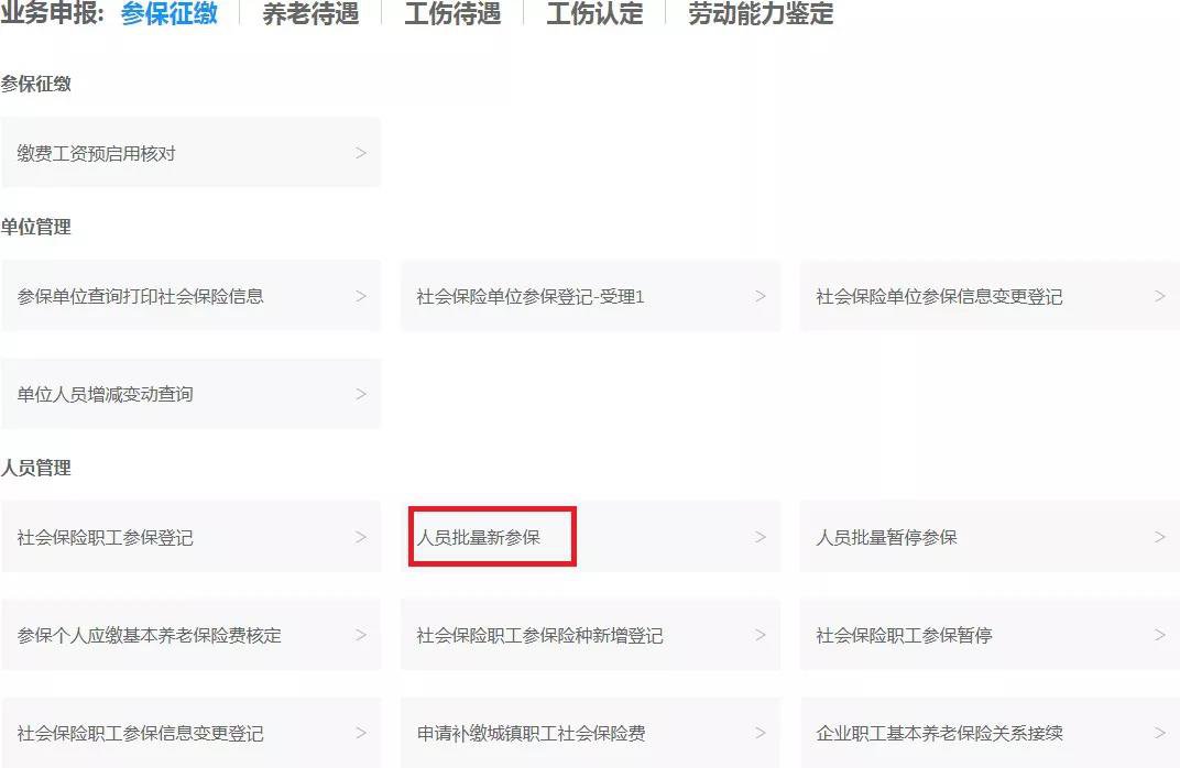 选择【参保征缴】,点击【人员批量暂停参保】。