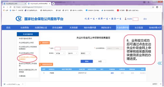 8、业务提交成功后可通过点击左边失业补助金网上申领审核结果查询模块,查询该业务的办理进度。