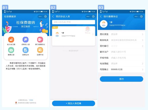 4、微信签约:微信小程序搜索“浙江税务社保缴费”—我要办理—录入参保人员姓名和身份证号—银行缴费协议—银行缴费协议。该方式只能给本人签约,无法将他人签约在本人银行卡下。