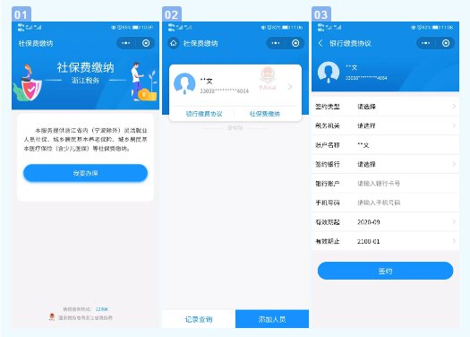 4、微信签约:微信小程序搜索“浙江税务社保缴费”—我要办理—录入参保人员姓名和身份证号—银行缴费协议—银行缴费协议。该方式只能给本人签约,无法将他人签约在本人银行卡下。