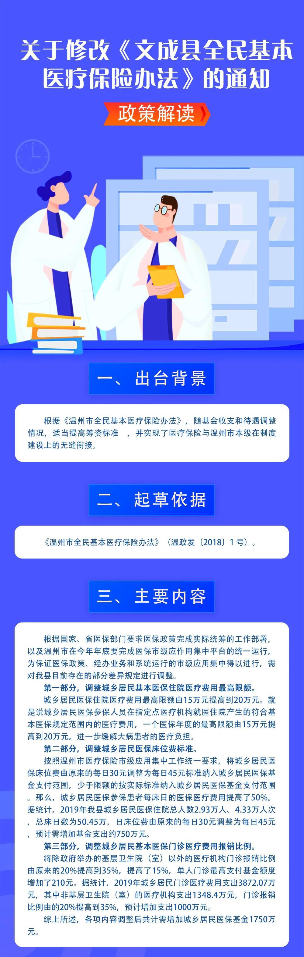 近日,文成县人民政府办公室印发《文成县全民基本医疗保险办法修改决定的通知》。该办法将于2021年1月1日起实施,这将进一步确保城乡居民基本医疗保障政策的延续性,保证基金安全、高效和平稳运行,切实和可持续地减轻群众看病负担,进一步满足人民群众医疗服务需求。