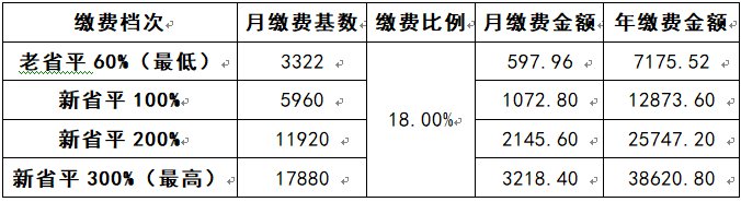 最低缴费基数精确到元,同时将缴费基数=“老省平”5536元的100%、200%、300%的参保人员,按“新省平”5960元的对应比例启用,具体如下: