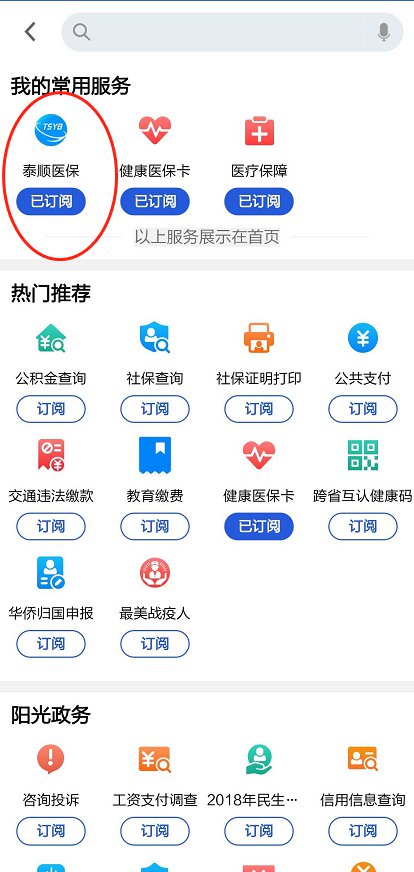 第二步:首页查找搜索“泰顺医保”,并点击进入“泰顺医保”订阅号界面;(关注订阅号后,便可在“更多”选项中直接进入“泰顺医保”订阅号)