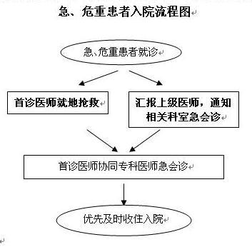 1)急、危重病人入院时要遵守一般病人入院流程。对病情危重的不稳定病人,如休克病人、严重创伤病人、昏迷病人等,首诊医生应立即就地抢救,必要时及时通知上级医师和相关专科医师会诊,专科医师会诊后决定收入院治疗的,由会诊医师联系病区安排入院事项。