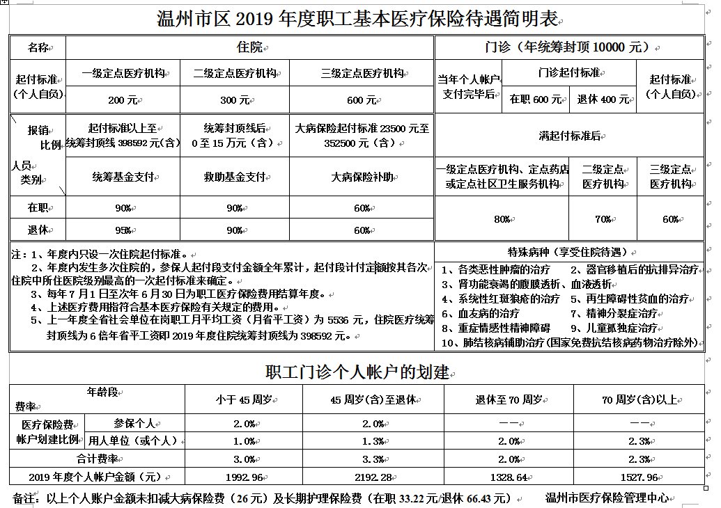 温州市区2019年度职工基本医疗保险待遇简明表