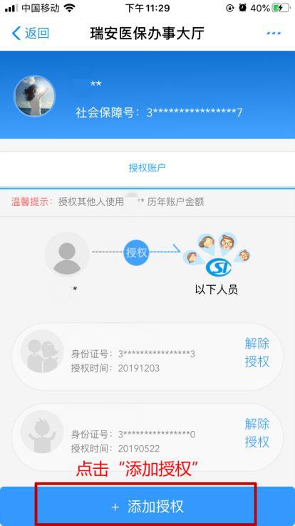 下载手机支付宝APP并注册登录——在首页中搜索“瑞安医保”——点击“瑞安医保”——点击“办事大厅”——点击“家庭共济”——点击“添加授权”——阅读个人账户家庭共济使用说明——勾选“同意”——点击“下一步”——按要求填写被授权人信息并点击申请。
