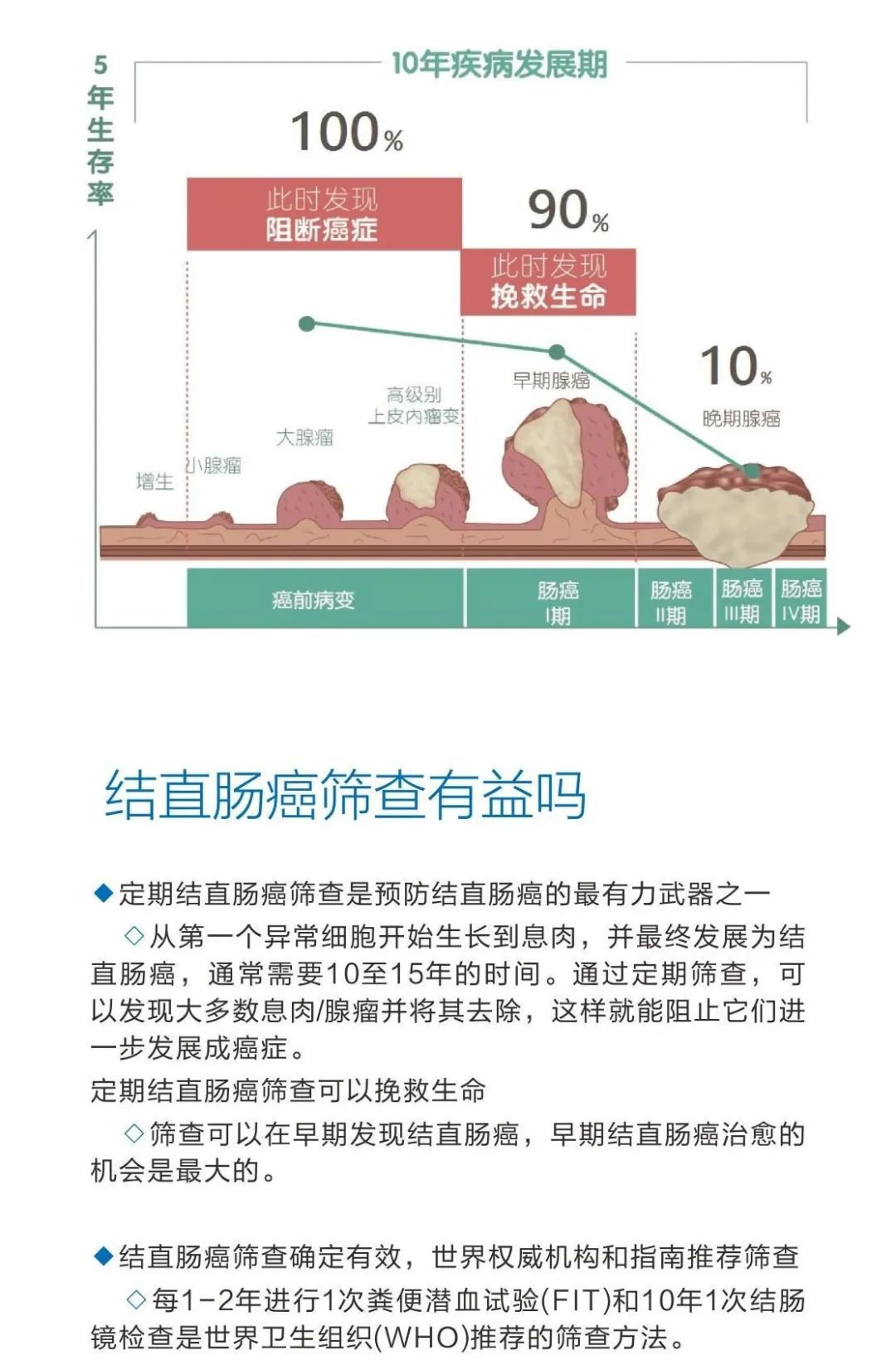 如果结直肠癌能早期发现,其5年相对生存率超过90%,而晚期生存率仅为10%。但结直肠癌往往起病隐匿,号称沉默的“杀手”。早期通常没有症状不易察觉。通过筛查可以早期发现结直肠癌,不仅能显著提升患者的5年生存率和生命质量,还能大幅减少医疗支出。