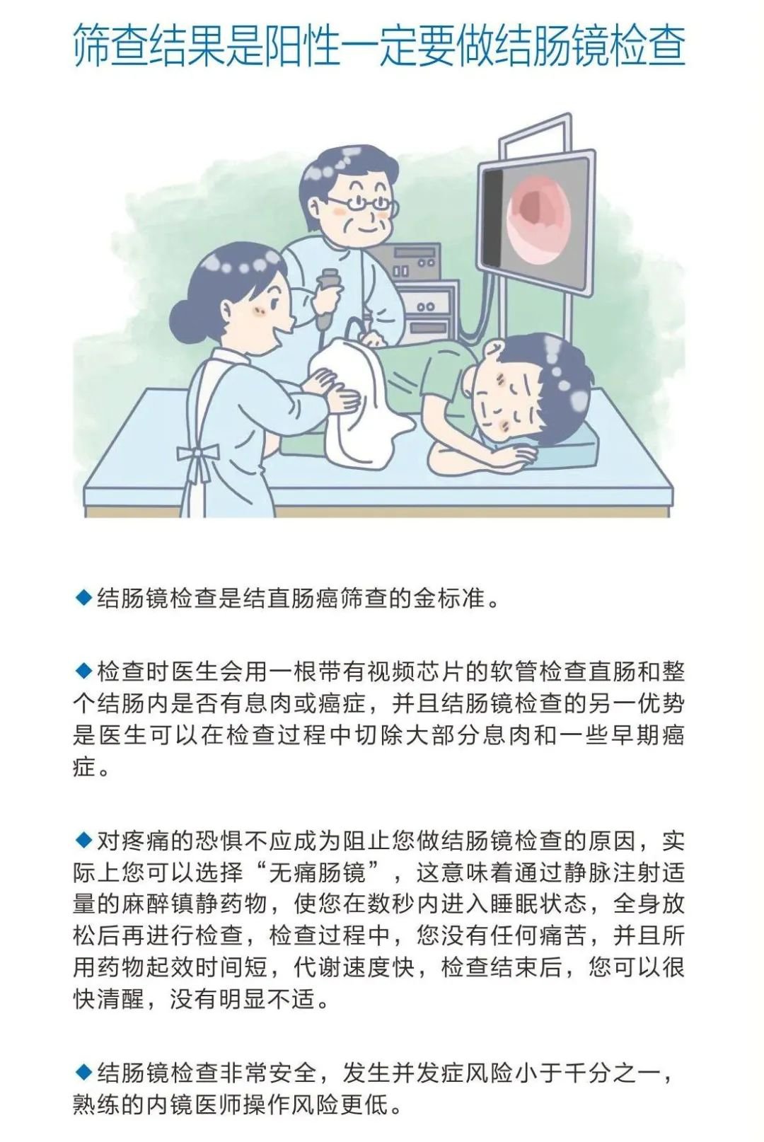 如果您的筛查结果为阳性,意味着您患结直肠癌的风险较高或粪便潜血试验阳性,需要进一步肠镜检查。