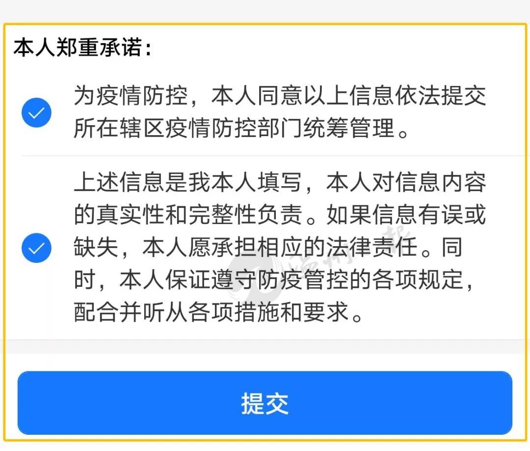 三、如实填写健康信息,勾选下方“本人郑重承诺”,确认无误后点击“提交”