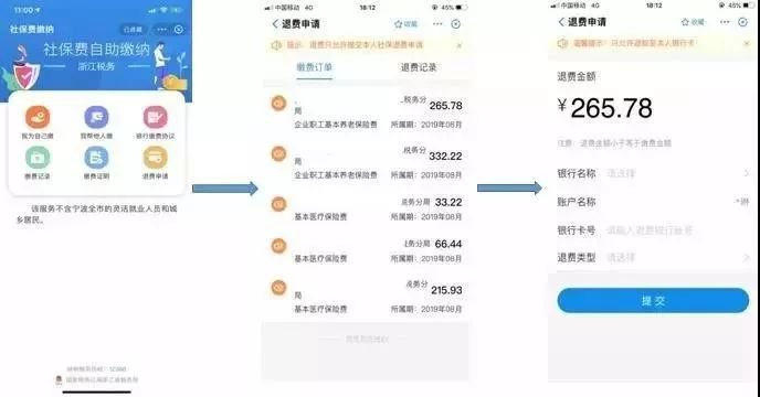 点击首页“退费申请”功能,进入“退费申请”页面, 选择想退费的记录,填写银行名称、账户名称等相关信息,并输入需要退款的缴费金额后,点击“提交”。