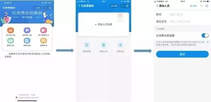 点击首页“我帮他人缴”功能,进入“人员列表页面”,点击“+添加人员信息”,需输入姓名、身份证号,点击需要缴纳社保费的用户,进入“社保缴纳”页面,之后流程参照“我为自己缴”。