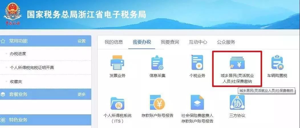 (四)登录成功后,点击【我要办税】-【城乡居民(灵活就业人员)社保费缴纳】进入征缴界面。