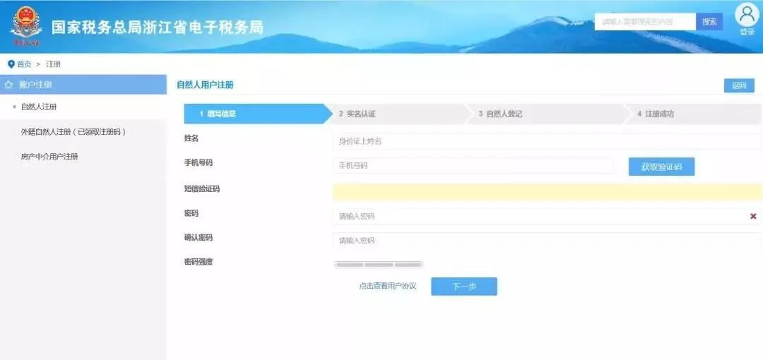 (二)若缴费人尚未注册电子税务局,点击首页右上方【登录】-【用户名登录】-【注册】。出现新界面后选择【自然人注册】,点击右上方【注册】,按照要求进行操作。其中【实名认证】模块需通过支付宝扫码进行刷脸认证。注册完成后,按照第一步的操作步骤完成登录。