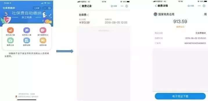 点击首页“缴费记录”功能,进入“缴费记录列表”,该页面为该支付宝账号所缴纳的所有的社保记录(包括自己缴和帮他人缴),用户也可以在该界面下载“电子缴费凭证”。
