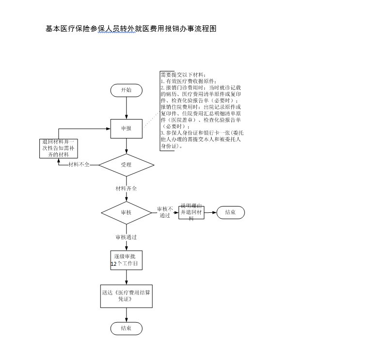 受理审核审批 | 12个工作日 | 温州市医疗保险管理中心 | 《温州市全民基本医疗保险办法》(温政发〔2018〕1号)第六十六条 参保人员因病情需要转温州市外(省内“一卡通”医疗机构除外)就诊的,需辖区内二甲或以上医疗机构(温州市区原则上需三级医疗机构)出具转诊证明书。 已办理转诊手续或因紧急情况就医的参保人员,其发生的符合基本医疗保险规定范围的住院和特殊病种门诊医疗费用,职工医保参保人员先由个人按10%自理,再按参保地基本医疗保险住院统筹待遇支付;城乡居民医保参保人员按本办法第三十二条第(三)项规定执行。 未办理转诊手续(紧急就医除外)的参保人员,自行到温州市外医疗机构就诊的,其医疗费用报销比例在原有基础上明显下降,其中,温州市区下降比例为25%。城乡居民医保参保人员未按规定转诊到市内三级定点医疗机构就诊的,医保报销比例在原有基础上,下降不低于5个百分点,其中,温州市区下降10个百分点。 |