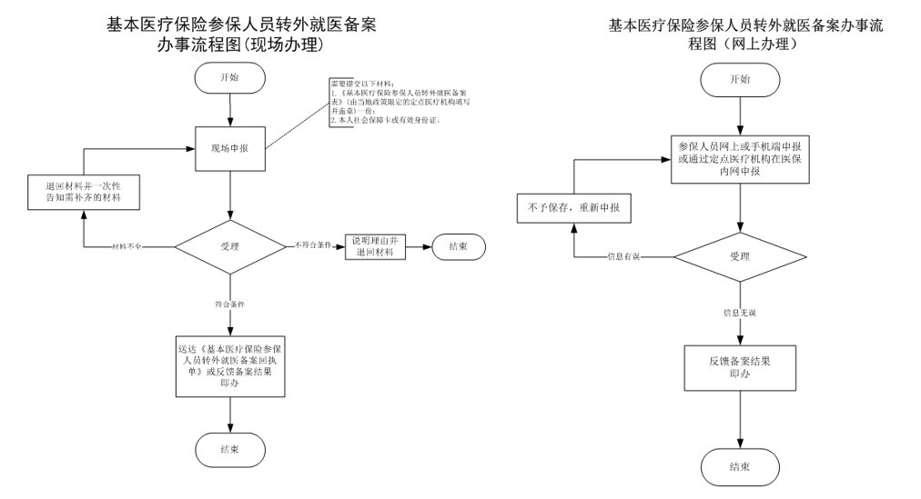 环节 办理时限 办理人员 审批标准 办理结果 申请 申请人通过省医保定点医疗机构网上申报,或登录浙江省政务服务网,或浙里办手机端提交申请材料,或向温州市医疗保险管理中心现场申请 (一)医院端办理需提供本人社会保障卡或有效身份证原件; (二)经办窗口受理需提供《基本医疗保险参保人员出国(境)带药备案表》(由市级医疗保险定点三级医疗机构填写并盖章)一份 受理审核 0个工作日 温州市医疗保险管理中心 1.《温州市全民基本医疗保险办法》(温政发〔2018〕1号)第六十六条 参保人员因病情需要转温州市外(省内“一卡通”医疗机构除外)就诊的,需辖区内二甲或以上医疗机构(温州市区原则上需三级医疗机构)出具转诊证明书。 已办理转诊手续或因紧急情况就医的参保人员,其发生的符合基本医疗保险规定范围的住院和特殊病种门诊医疗费用,职工医保参保人员先由个人按10%自理,再按参保地基本医疗保险住院统筹待遇支付;城乡居民医保参保人员按本办法第三十二条第(三)项规定执行。 未办理转诊手续(紧急就医除外)的参保人员,自行到温州市外医疗机构就诊的,其医疗费用报销比例在原有基础上明显下降,其中,温州市区下降比例为25%。城乡居民医保参保人员未按规定转诊到市内三级定点医疗机构就诊的,医保报销比例在原有基础上,下降不低于5个百分点,其中,温州市区下降10个百分点。 反馈登记 0个工作日 温州市医疗保险管理中心 1.《温州市全民基本医疗保险办法》(温政发〔2018〕1号)第六十六条 参保人员因病情需要转温州市外(省内“一卡通”医疗机构除外)就诊的,需辖区内二甲或以上医疗机构(温州市区原则上需三级医疗机构)出具转诊证明书。 已办理转诊手续或因紧急情况就医的参保人员,其发生的符合基本医疗保险规定范围的住院和特殊病种门诊医疗费用,职工医保参保人员先由个人按10%自理,再按参保地基本医疗保险住院统筹待遇支付;城乡居民医保参保人员按本办法第三十二条第(三)项规定执行。 未办理转诊手续(紧急就医除外)的参保人员,自行到温州市外医疗机构就诊的,其医疗费用报销比例在原有基础上明显下降,其中,温州市区下降比例为25%。城乡居民医保参保人员未按规定转诊到市内三级定点医疗机构就诊的,医保报销比例在原有基础上,下降不低于5个百分点,其中,温州市区下降10个百分点。 现场出具《基本医疗保险参保人员转外就医备案回执单》或反馈备案结果 基本流程图 办理方式 网上申请或现场申请 办结时限 法定时限:无期限 承诺期限:即办 审批结果 转诊系统批复 结果送达 自作出决定之日起3个工作日内送达 送达方式:当场送达,电子文件网上送达 办理进程和结果公开查询 电话查询:0577-12345 小编贴士 想了解更多关于温州市医疗挂号、医保参保缴费、医保关系转移接续办理等相关的信息吗?