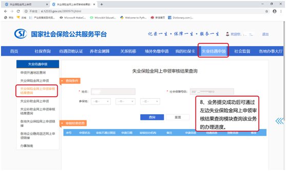 8、业务提交成功后可通过点击左边失业补助金网上申领审核结果查询模块,查询该业务的办理进度。