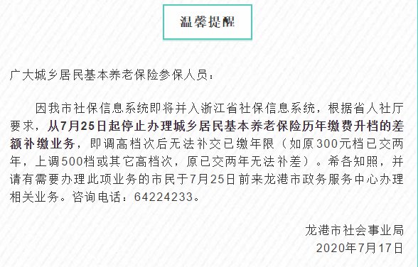 因我市社保信息系统即将并入浙江省社保信息系统,根据省人社厅要求,从7月25日起停止办理城乡居民基本养老保险历年缴费升档的差额补缴业务,即调高档次后无法补交已缴年限(如原300元档已交两年,上调500档或其它高档次,原已交两年无法补差)。