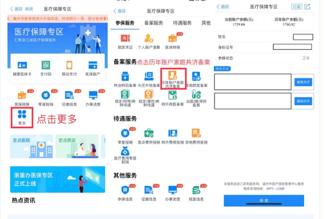 操作步骤:点击更多——点击历年账户家庭共济备案——点击新增——阅读家庭共济须知——按要求填写被授权人信息并点击申请。