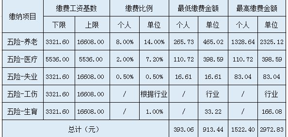 企业单位职工:月缴费基数最低为3321.6元,最高为16608元;