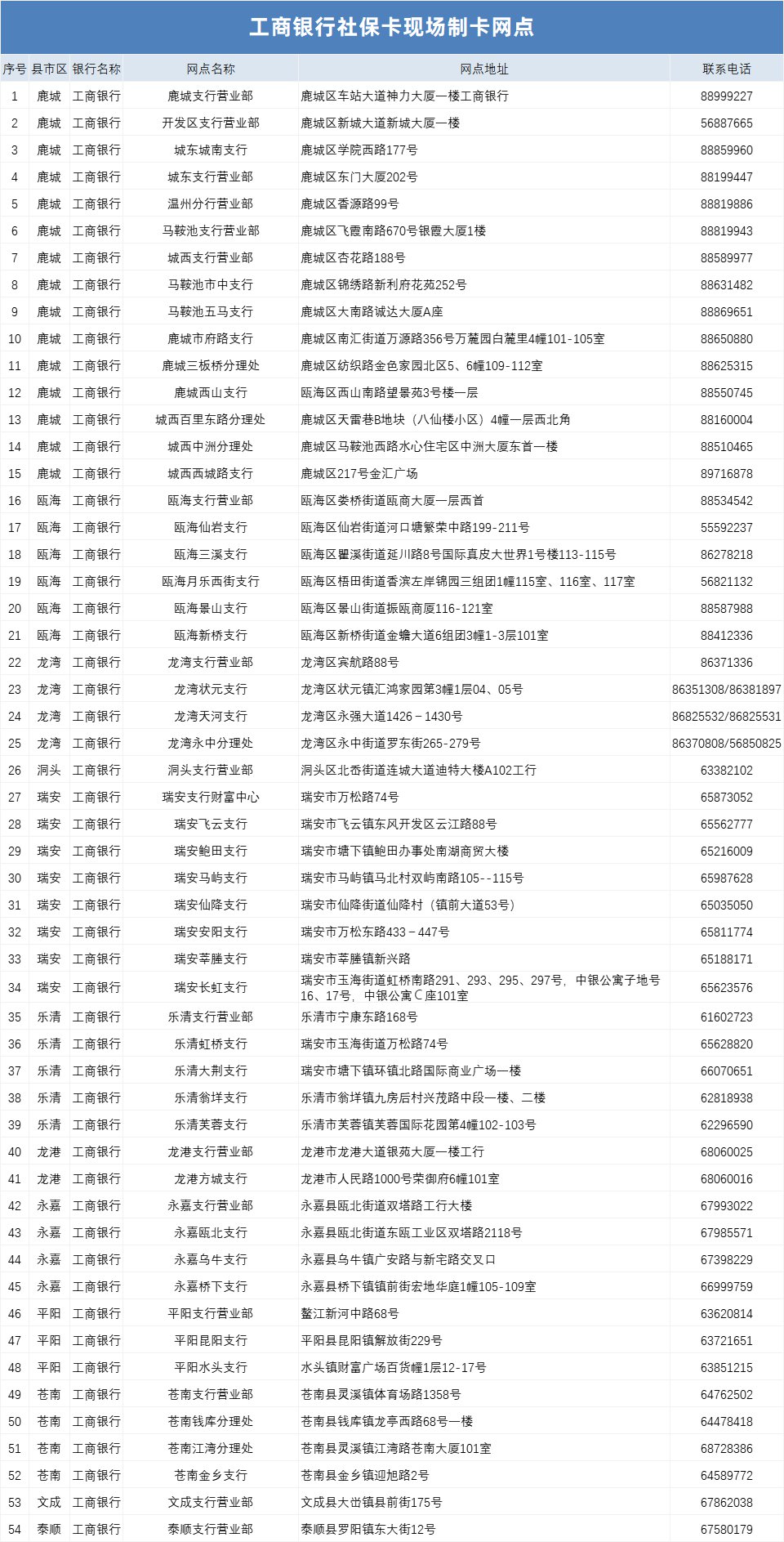 目前,温州市工商银行、农业银行、中国银行、建设银行、交通银行、邮储银行、温州银行、农商行等部分网点均可申领第三代社保卡。市民在全市8家合作银行1061个网点均可办理相关业务。
