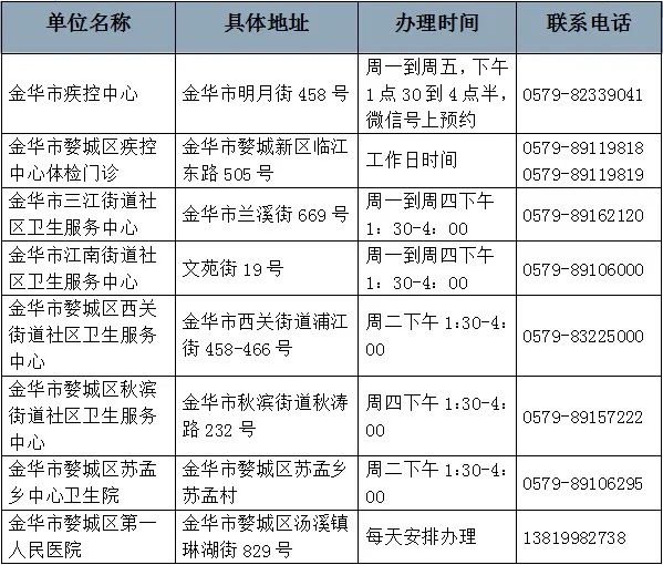 金华市各县(市、区)食品行业从业人员健康证明办理点信息来咯市区