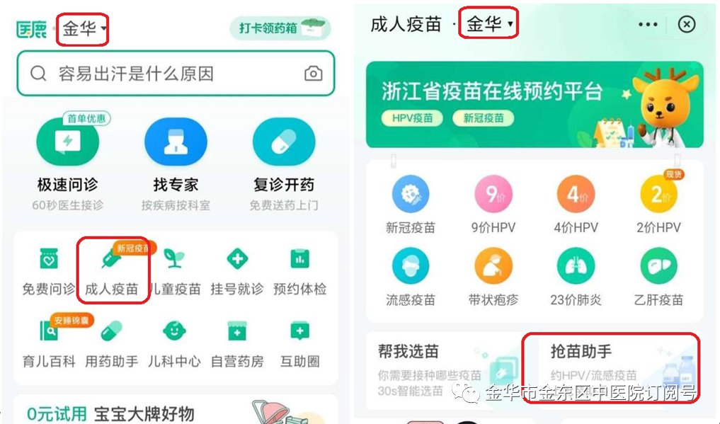 2、选择“金华”地区,点击“医鹿”App首页“成人疫苗” ,进入页面后再点击“抢苗助手”