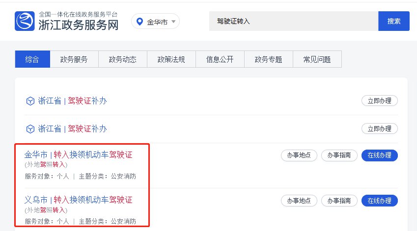 第一步:百度搜索浙江政务服务网,进入后选择金华市,搜索框输入驾驶证转入;