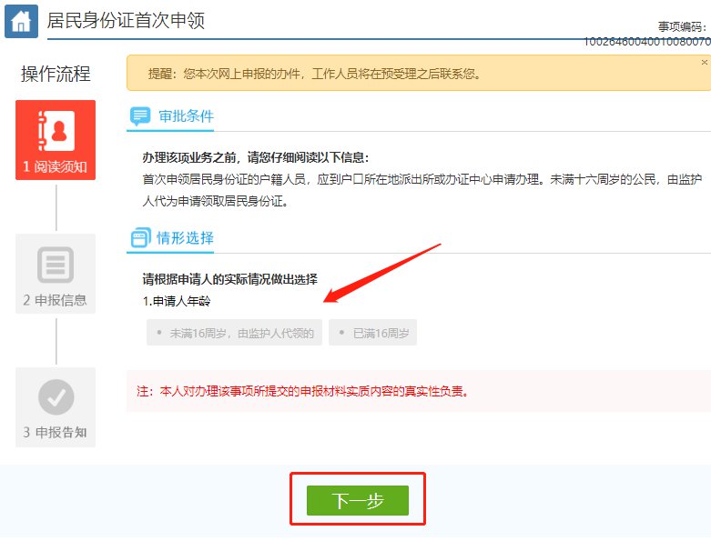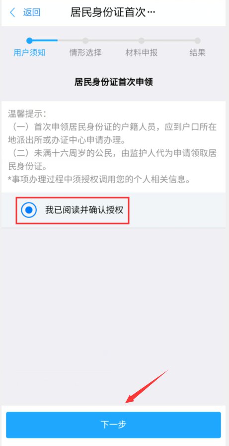 阅读须知,选择我已阅读并确认授权,点击下一步。根据自己符合的情形进行选择,提交材料,完成提交结果显示受理通过后本人带户口本前往户口地所在派出所(办证中心)现场进行指纹、人像的采集,完成办理。