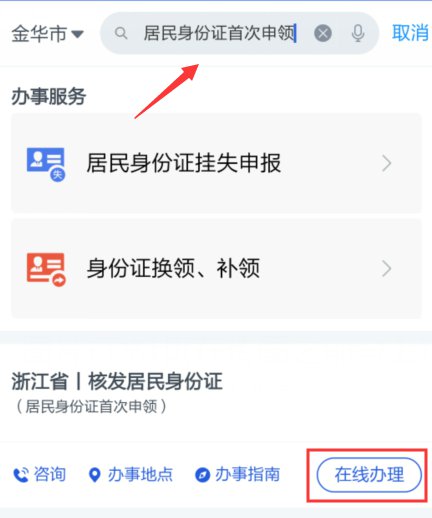 打开浙里办APP,在搜索框搜索“居民身份证首次申领”,点击在线办理